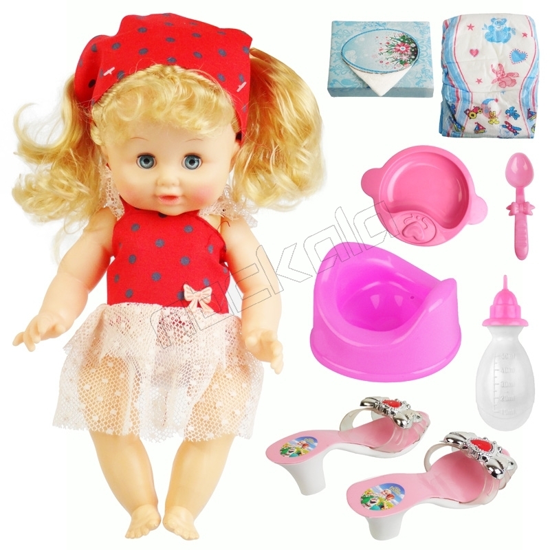 ✔ ست عروسک 8تکه: عروسک، شیشه شیر ، پوشک ، لگن دستشویی ، دستمال کاغذی ، قاشق ، ظرف غذا و یک جفت کفش پاشنه بلند